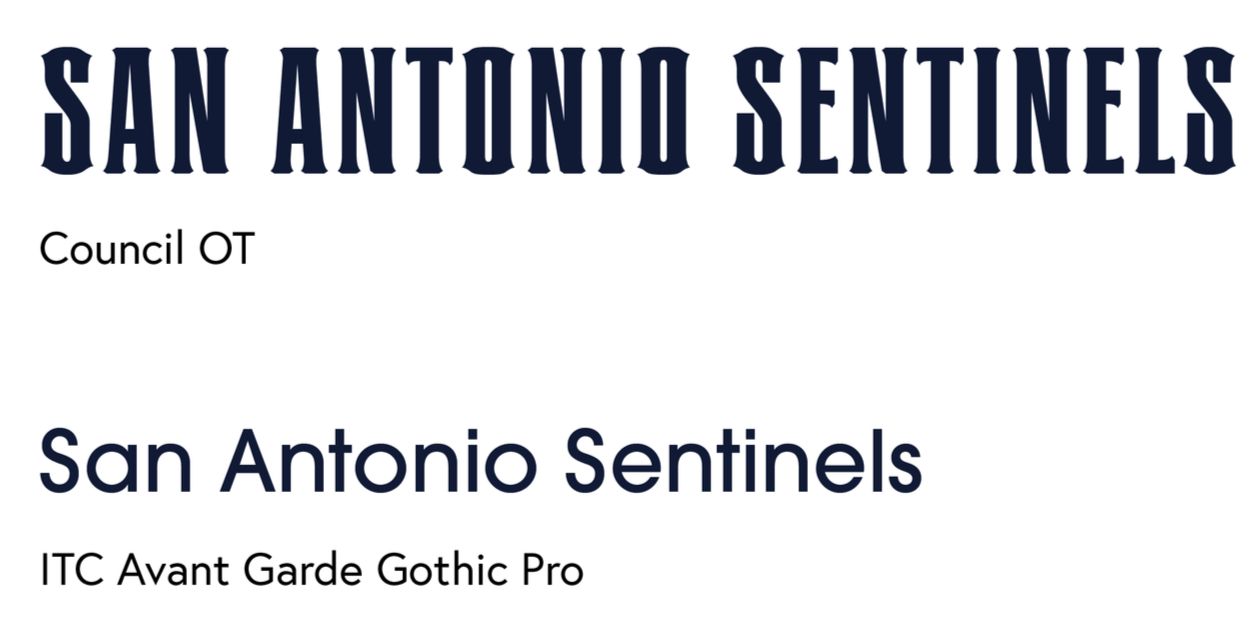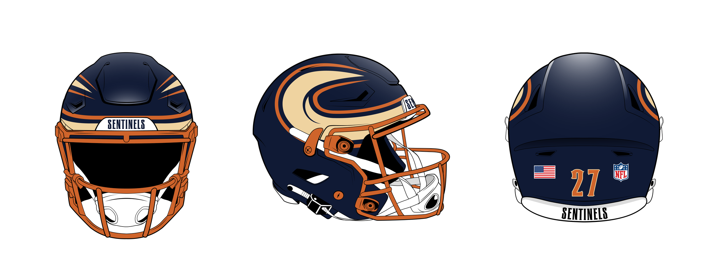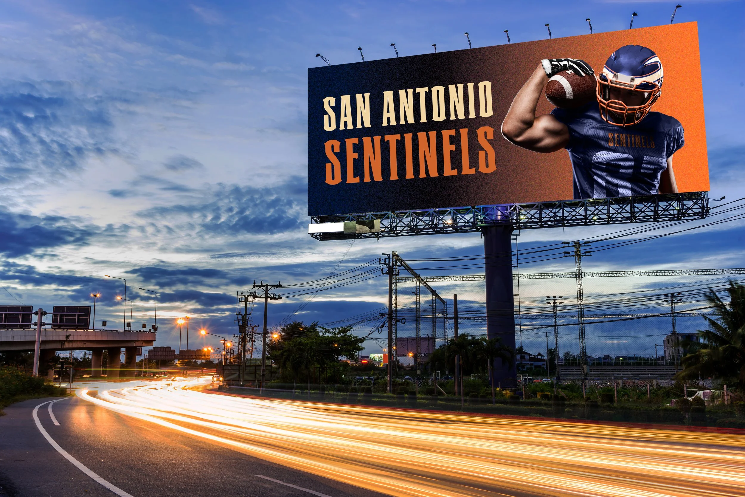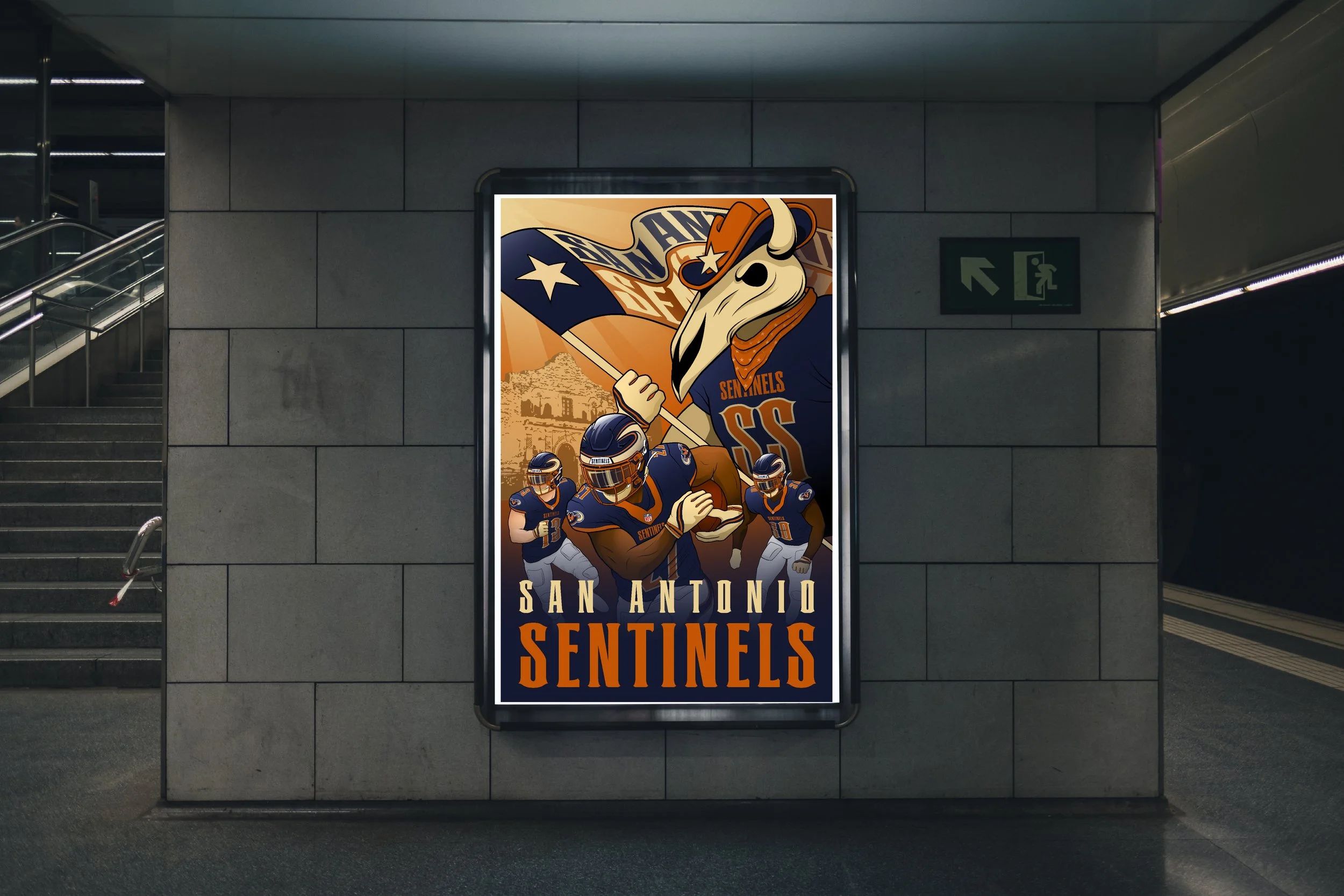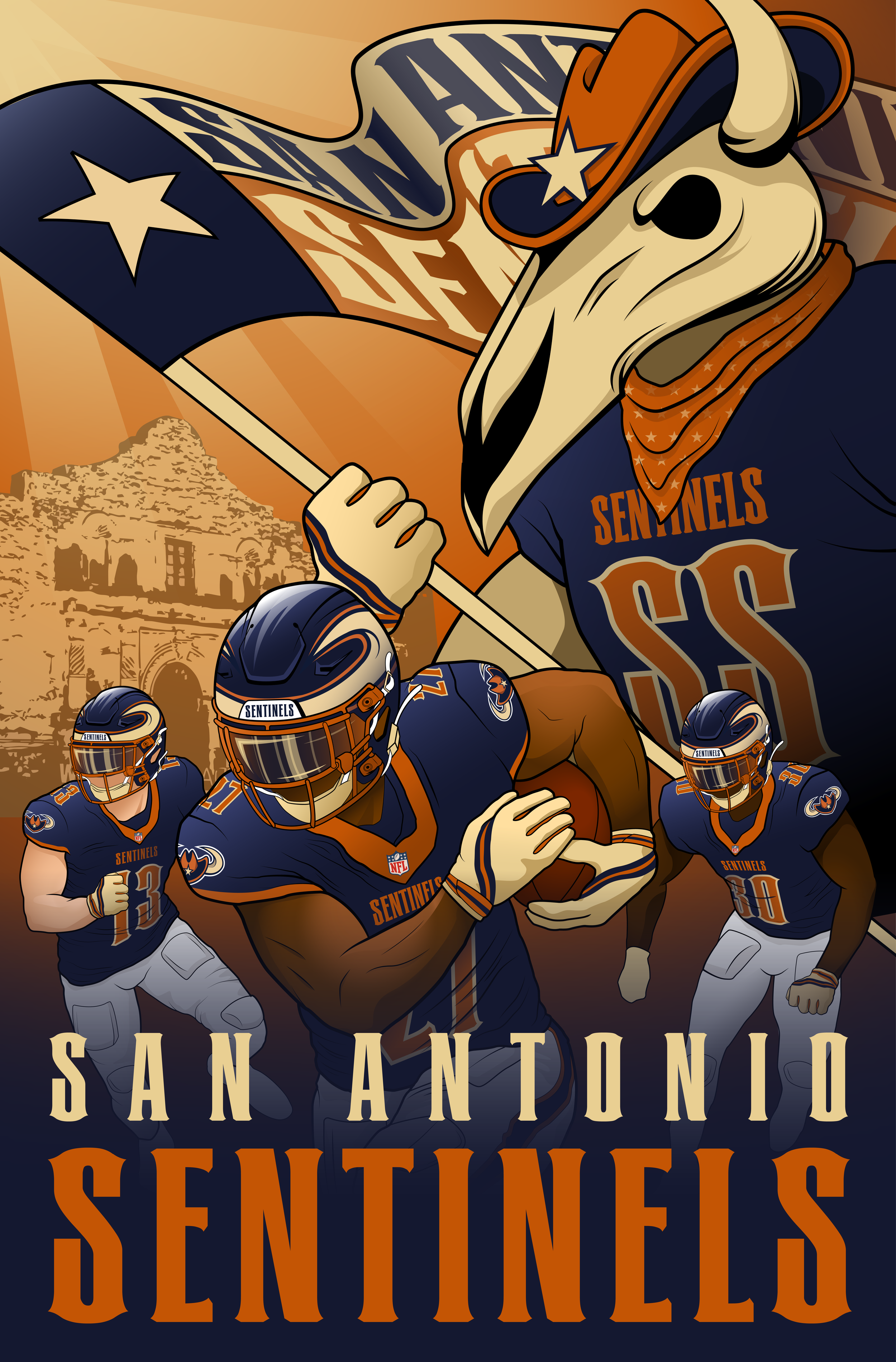 Paying homage to its home state, the San Antonio Sentinels logo features Texas Longhorn horns, the Lone Star, and a cowboy hat.